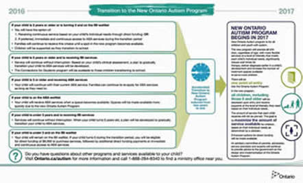 Ontario ABA and IBI Information Click picture below to enlarge Ministry of Children and Youth Services-Guidelines Bridging Children from Intensive Behavioural Intervention Services to the New Ontario Autism Program~ Replaces “Guidelines: Transitioning Children from Intensive Behavioural Intervention Services,Autism Intervention Program”, June 2016.As the Minister of Children and Youth Services communicated on June 29, 2016, during the transition to the new Ontario Autism Program (OAP), children who are five years and older who are currently receiving Intensive Behavioural Intervention (IBI) services will not be removed from services. These children will continue with their current service plans until their next regular clinical progress assessments. At that time, the Autism Intervention Program (AIP) clinician will work with the child’s family and, if the child is receiving services through the Direct Funding Option, in collaboration with the supervising psychologist of the private program to develop an individualized service plan that will bridge the child to the new Ontario Autism Program beginning in June 2017. The intensity of services will not be based on age or on any predetermined level. The intensity of services will be based on the child’s individual needs. The individualized service plan will provide the framework for each child’s successful transition into the new OAP. Ontario Providing More Supports For Children With Autism~ New Program to Start One Year Earlier~ June 28, 2016~ Ontario is providing more support for children and youth with autism, including an accelerated implementation of the new Ontario Autism Program. The new program will provide all children, regardless of age, with more flexible services at a level of intensity that meets each child's individual needs, significantly reduce wait times for service, and increase the number of treatment spaces available to serve more children and accommodate the rising prevalence in autism diagnoses. Strengthening the Ontario Autism Program~June 28,2016~ The 2016 Ontario Budget committed $333 milion over 5 years for Ontario`s new autism program.This is in addition to the $190 million that Ontario already invests in autism services for children and youth annually. Today, Ontario is announcing an additional $200 million investment over the next four years for additional supports for children and youth with autism. 1)Implementing the Ontario Autism Program sooner-The implementation of the new Ontario Autism Program will now begin in June 2017, a full year ahead of the initially planned date of June 2018. Ontario Autism Program~ Children five years old and older will be transitioned from the IBI waitlist and supported with one-time funding during the transition phase. The funding can be used to purchase eligible community services and supports during the transition to the more flexible and intensive autism program that better meets their needs. Ontario Investing $333 Million to Improve Autism Services~March 29,2016 New Autism Program to Reduce Waitlists and Provide Better Services for Families...... As part of the 2016 Budget, Ontario is investing $333 million over the next five years to launch the new Ontario Autism Program, which will provide children and youth with critical interventions faster, and provide services that are better matched to their needs. Benchmarks Panel Meeting Summary, June 2008 (written by a group of parents who attended the meeting) Making a Difference for Children with Autism Spectrum Disorders in Ontario Schools (Report of the Ministers Autism Spectrum Disorder Group, 2007) 225 Spaces Being Created in January 2007