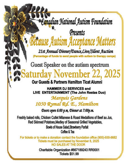 Effective January 1st 2015 Due to the increased costs the Canadian National Autism Foundation will only automatically issue paper tax receipts for amounts of $50.00 or greater. Tax receipts for amounts less than $50.00 will be issued via e-mail unless a paper receipt specifically requested. No tax receipts for $10.00 and under. Paul Reilly- Vice-President/ Treasurer Canadian National Autism Foundation 2025 Upcoming Events Below Our Upcoming Dinner Dance Live and Silent Auction LIMITED TICKETS AVAIALBLE