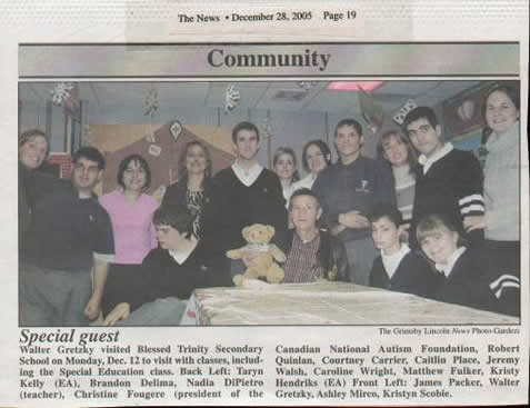 Walter Gretzky and the Hamilton Bulldogs have joined up with the Canadian National Autism Foundation to further Autism Awareness. One way in which this is being accomplished is by Mr. Gretzky and representatives from the Hamilton Bulldogs attending school assemblies and awarding students who assist others with Autism at their school with Certificates of Appreciation and tickets to Bulldogs games. Here are a few pictures of the last few visits.